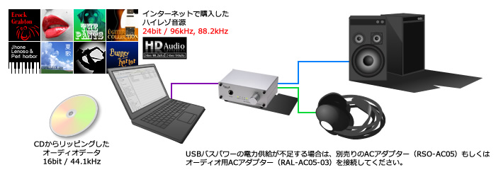 REX-A2496HA1 は、OS標準ドライバーを採用し、どなたでも簡単に接続・設定し、手軽にハイレゾ音源(24bit, 88.2kHz/96kHz)を楽しむことが可能です。また、独立したヘッドホンアンプを搭載したことによりUSB接続ヘッドホンアンプ(32.28mW×2ch@68Ω)として使用でき、オーバーヘッドホンの能力を引き出すことができます。